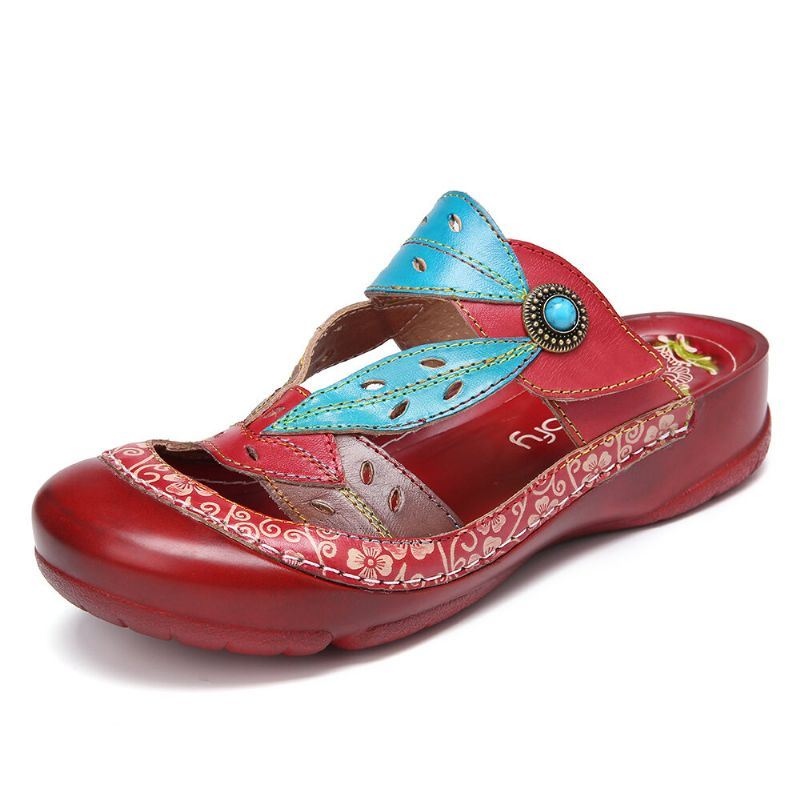 Damskie Ręcznie Robione Skórzane Wysadzane Koralikami Kwiatowe Wycięcie Regulowany Pasek Wsuwane Klapki Drewniaki Sandały