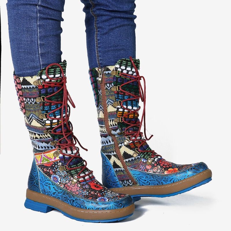 Damskie Tłoczone Łączenie Kolorowe Wełniane Okrągłe Toe Sznurowane Płaskie Wysokie Buty Płaskie