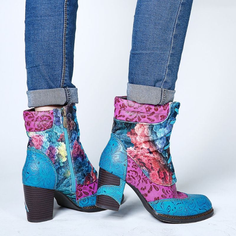 Damskie Wytłoczone Prawdziwej Skóry Kolorowe Chmury Wzór Modne Buty Na Wysokim Obcasie Sznurowane